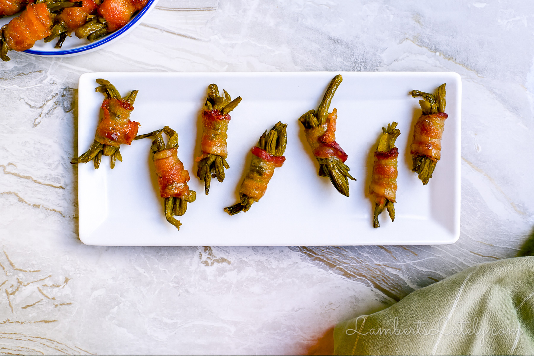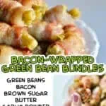 Green bean bundles wrapped in bacon with a brown sugar glaze - made easy with canned green beans. Sweet, smoky, perfectly bite-size, and make-ahead friendly.