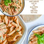 - Add 12oz cooked pasta, 2 cups of spinach, and ½ cup of chopped basil to the baking dish until pasta is incorporated and spinach & basil are slightly wilted.