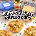 This recipe for Cheesy Sausage Rotel Cups combines the flavors of spicy sausage, Rotel tomatoes, Colby Jack cheese, and Velveeta in crispy mini phyllo shells. These are individual-serving appetizers with lots of texture and spicy flavor!
