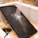 Rinse the remaining salt off of the griddle and give it a quick wash with warm water. Once you wash it down and all of the salt is gone, do not let it sit in the sink. Instead, take it right back to the gas stovetop.