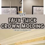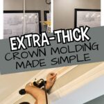 Check out this easy DIY for how to make existing crown molding look thick! Simply install additional trim molding and use a faux painting trick to make simple moulding look expensive.