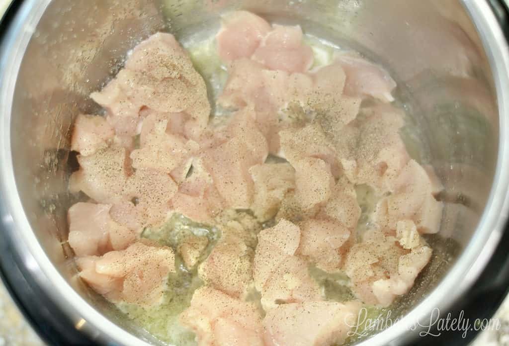 - Chop chicken into bite-sized pieces. Set the Instant Pot on the sauté setting and add 2 tablespoon butter; melt. Add chicken and brown for 5-8 minutes, seasoning liberally with salt and pepper.
