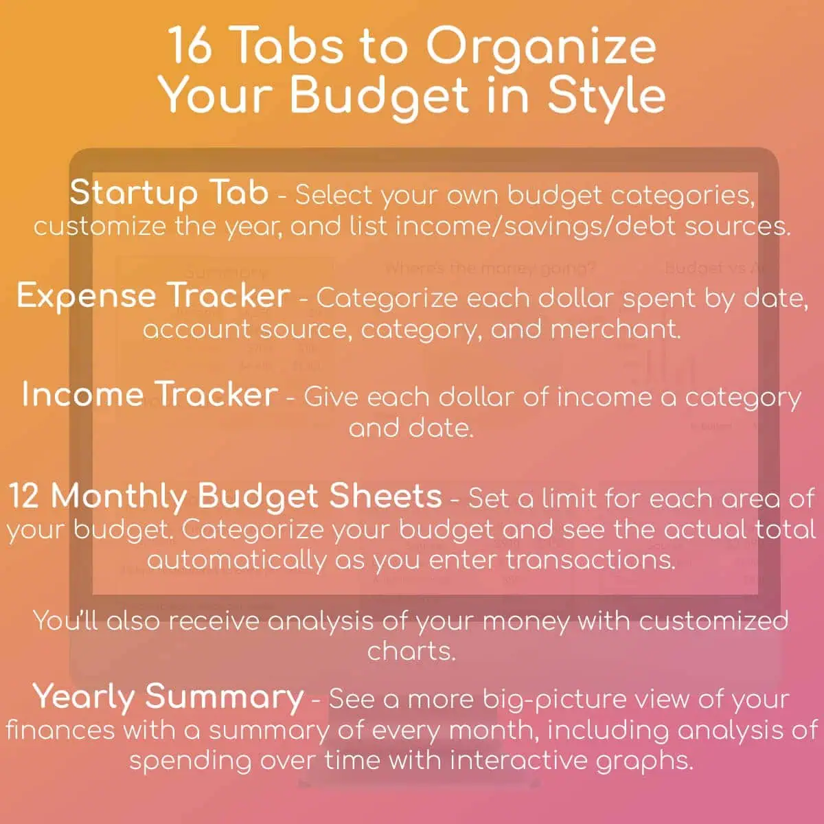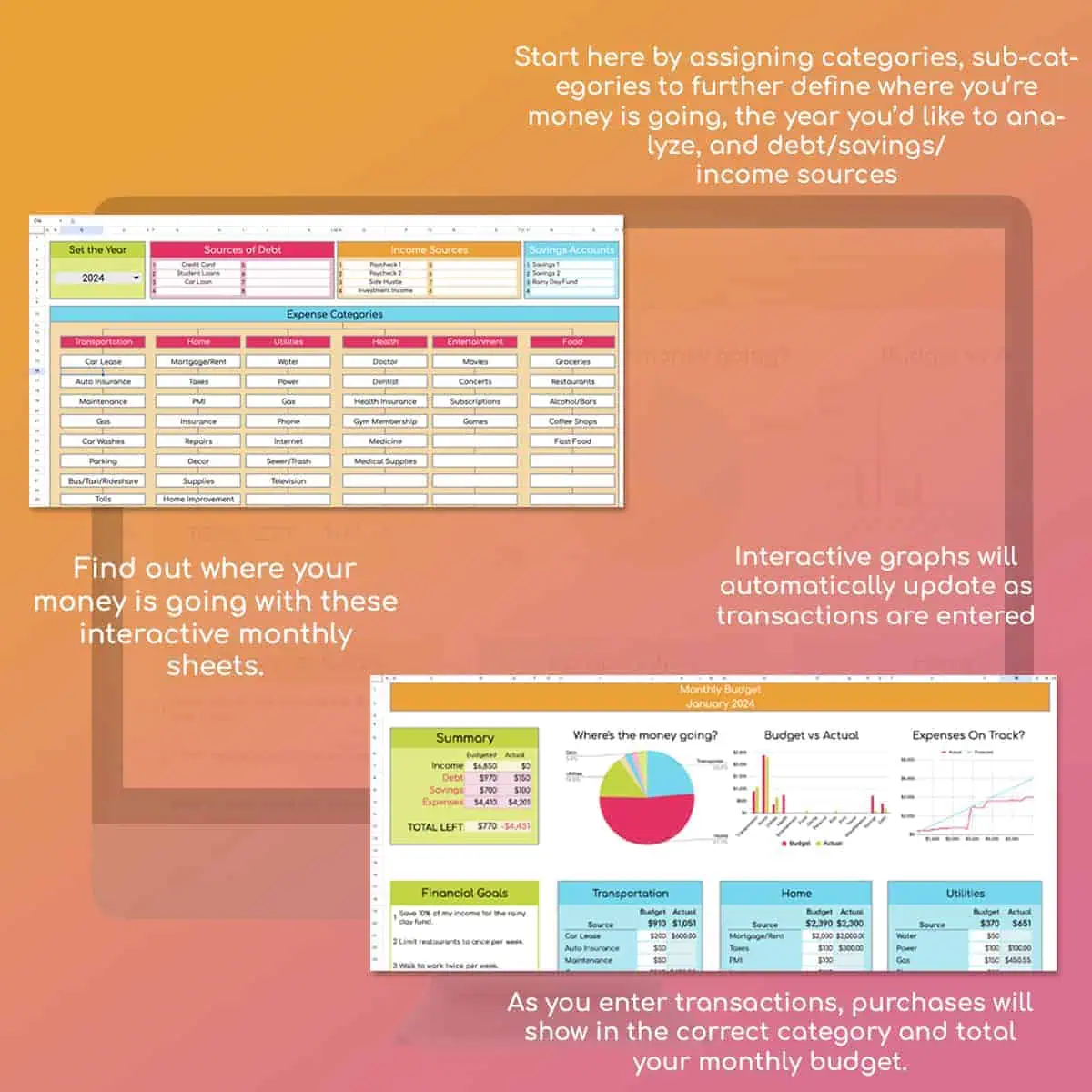 - 12 Monthly Budget Sheets - Set a limit for each area of your budget. Categorize your budget and see the actual total automatically as you enter transactions. You'll also receive analyses of your money with customized charts.