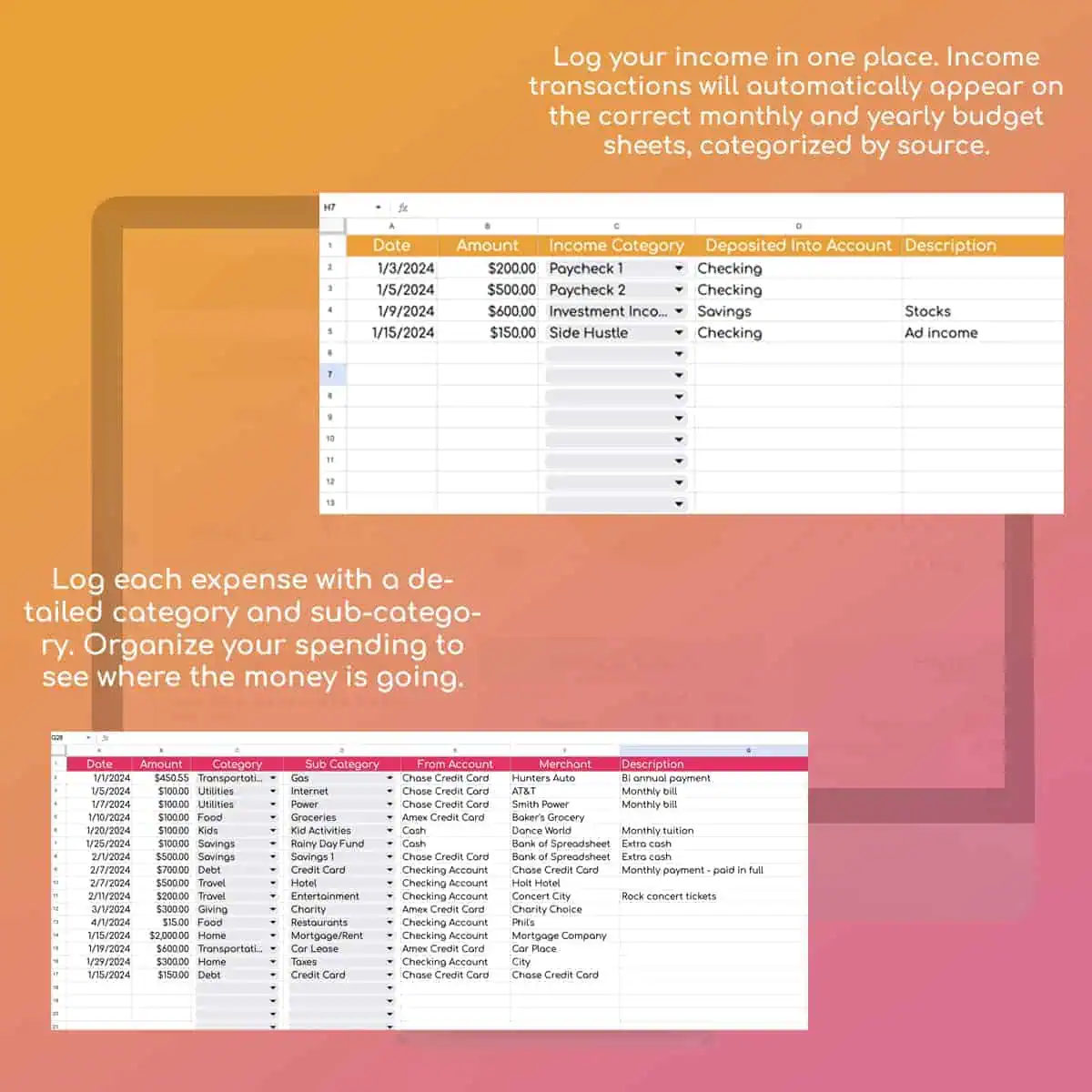 - Expense Tracker - Categorize each dollar spent by date, account source, category, and merchant.