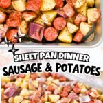 - Combine cut sausage, cut potatoes, and cut onion on a lined sheet pan. Drizzle with olive oil and seasoning. Toss well.